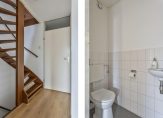 In de aanbouw aan de voorzijde is de entree van deze ruime, verduurzaamde woning. Via de kunststof voordeur loop je de ruime hal in, met laminaat op de vloer en de trap naar de eerste verdieping. Rechts in de hal zijn de meterkast en de in lichte kleuren uitgevoerde toiletruimte met fonteintje.