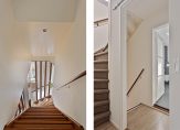 In de woonkamer is een open, hardhouten trap naar de eerste verdieping. De overloop, die uit twee delen bestaat, biedt toegang tot drie slaapkamers en de badkamer. In alle slaapkamers en op de overloop ligt laminaat en de deuren zijn uitgevoerd als mooie, lichte paneeldeuren.
