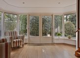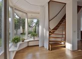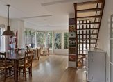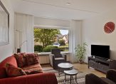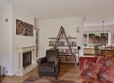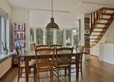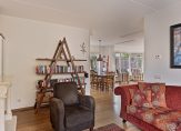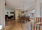 Met een totale oppervlakte van bijna 50 m2 zijn de woonkamer, eetkamer, serre en keuken heerlijk ruim. Het zitgedeelte met gashaard is aan de voorzijde, met mooi uitzicht naar de tuin en het autovrije pad. De eetkamer grenst aan de keuken en de serre, met openslaande deuren naar de tuin, is ingericht als tweede zitgedeelte. Het uitzicht naar de tuin, zonder inkijk, is ieder seizoen fantastisch.