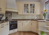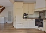 In de keuken staat een U-opstelling in een landelijke stijl, met een granieten aanrechtblad en lichte tegels op de wand. De achterwand bij het kookgedeelte is ook afgewerkt met graniet en alle benodigde apparatuur is ingebouwd: een inductie kookplaat (2019), afzuigkap, oven, vaatwasser, close-in boiler en een koelkast.