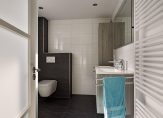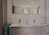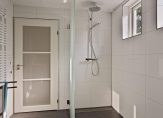 De moderne badkamer (2017) heeft grote tegels op de wanden en vloer, uitgevoerd in wit en zwart. Je hebt de beschikking over een dubbel wastafelmeubel, hoge badkamerkast, een spiegel met verlichting, handdoekenradiator, tweede toilet en een ruime inloopdouche. Twee ramen in de zijgevel zorgen voor prettig lichtinval.