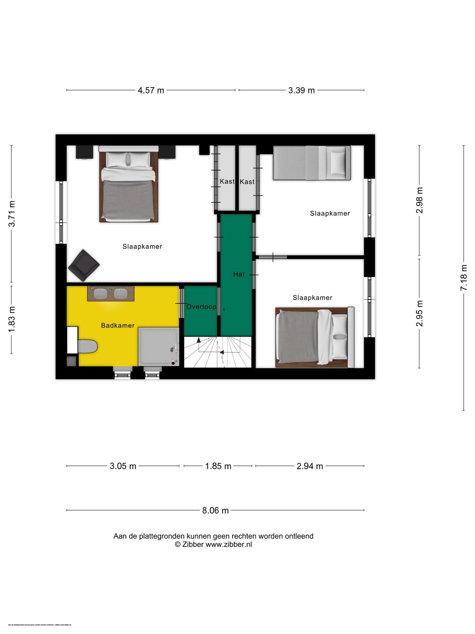 Aan de achterzijde zijn twee nagenoeg even grote slaapkamers, waarvan een met een inbouwkast. De ruime hoofdslaapkamer is aan de voorzijde met eveneens een inbouwkast.