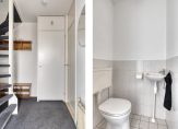We gaan via de voordeur, en stappen de hal in. Hier zijn de meterkast, de trap naar de eerste verdieping en de toiletruimte met fonteintje. Via de ramen in de voordeur valt veel licht naar binnen, waardoor de hal heel ruimtelijk oogt.