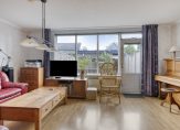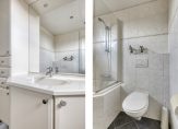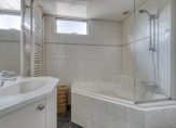 De badkamer is ingedeeld met een hoekbad, een wastafelmeubel, handdoekenradiator en een wandcloset. Het douchescherm maakt het mogelijk om te douchen in bad, en de lichte tegels maakt de badkamer optisch nog groter.
