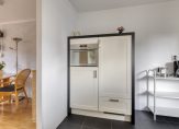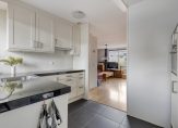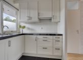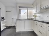 Aan de voorzijde is de ruime en lichte keuken, met een eigen entree en een donkere tegelvloer. De hoekopstelling en de halfhoge kastenwand bieden veel bergruimte, en alle apparatuur is ingebouwd: een keramische kookplaat, afzuigkap, vaatwasser, combimagnetron, koelkast en een vriezer. Wat opvalt aan de keuken is de grootte, waardoor het geen probleem is om gezellig samen te koken.