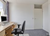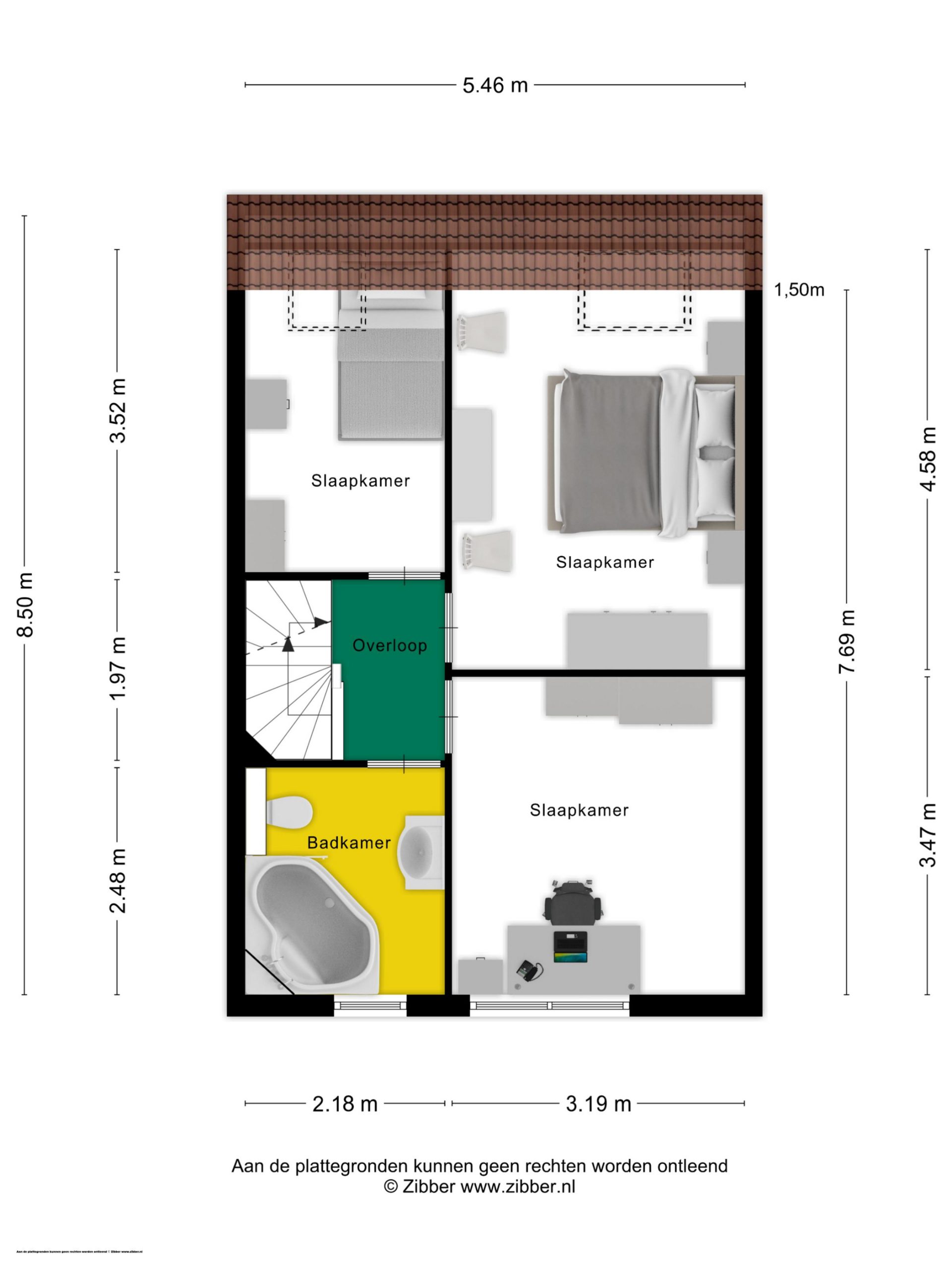 Vanaf de overloop zijn drie slaapkamers te bereiken, waarvan twee aan de achterzijde. Deze slaapkamers hebben een groot raam in het schuine dakvlak, met de mogelijkheid om een dakkapel te plaatsen. De derde slaapkamer, ingericht als werk-/studeerkamer, is aan de voorzijde.