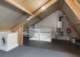 Een vaste trap geeft toegang tot een ruime zolderkamer, met een hoge nok en een dakvenster. Naast de trap is de opstelling van de HR-ketel, en op deze verdieping is de aansluiting voor de wasmachine. Deze kamer is zeer geschikt om te gebruiken als vierde slaapkamer, werkkamer of hobbyruimte.