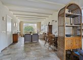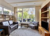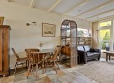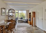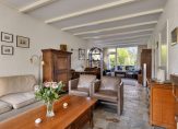 De woonkamer is een goed in te delen leefruimte met een lengte van meer dan 9.50 meter. In de huidige indeling zijn er een zithoek, een eetgedeelte en aan de achterzijde is het tv-gedeelte. Fraaie elementen zijn de schouw met open haard, de leisteenvloer en het glas-in loodraam in de zijgevel.