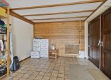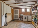 Vanuit de keuken is de L-vormige garage/berging te bereiken, waarvan een deel als wasruimte in gebruik is. Er liggen tegels op de vloer, de ruimte is verwarmd en de zolder biedt extra bergruimte.