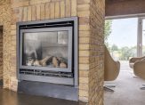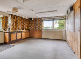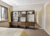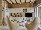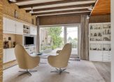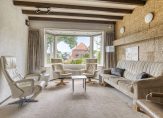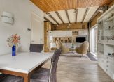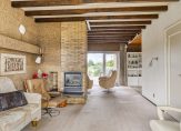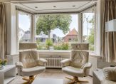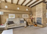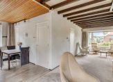 In de L-vormige woonkamer zie je dat de woning rond de jaren ’70 is verbouwd. Het hoge balkenplafond en de erker zijn behouden, en er valt veel licht naar binnen. Aan de voorzijde, bij de erker en de Barbas inbouw gashaard, is het zitgedeelte en aan de tuinzijde zie je een apart eetgedeelte. Waar vroeger de keuken was, staan nu de eettafel en een bureau. Tevens heb je hier de toegang tot de wijn-/provisiekelder.