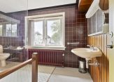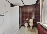 De ruime badkamer is ingedeeld met een douchecabine, een tweede douche met lage instap, een toilet, bidet en een wastafel. De tweede douche is geplaatst op de plek waar vroeger een ligbad stond.