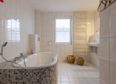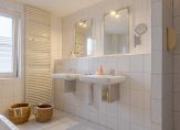 Overloop met toegang tot meerdere slaapkamers. De badkamer is compleet ingericht met ligbad, inloopdouche, dubbele wastafel en toilet.