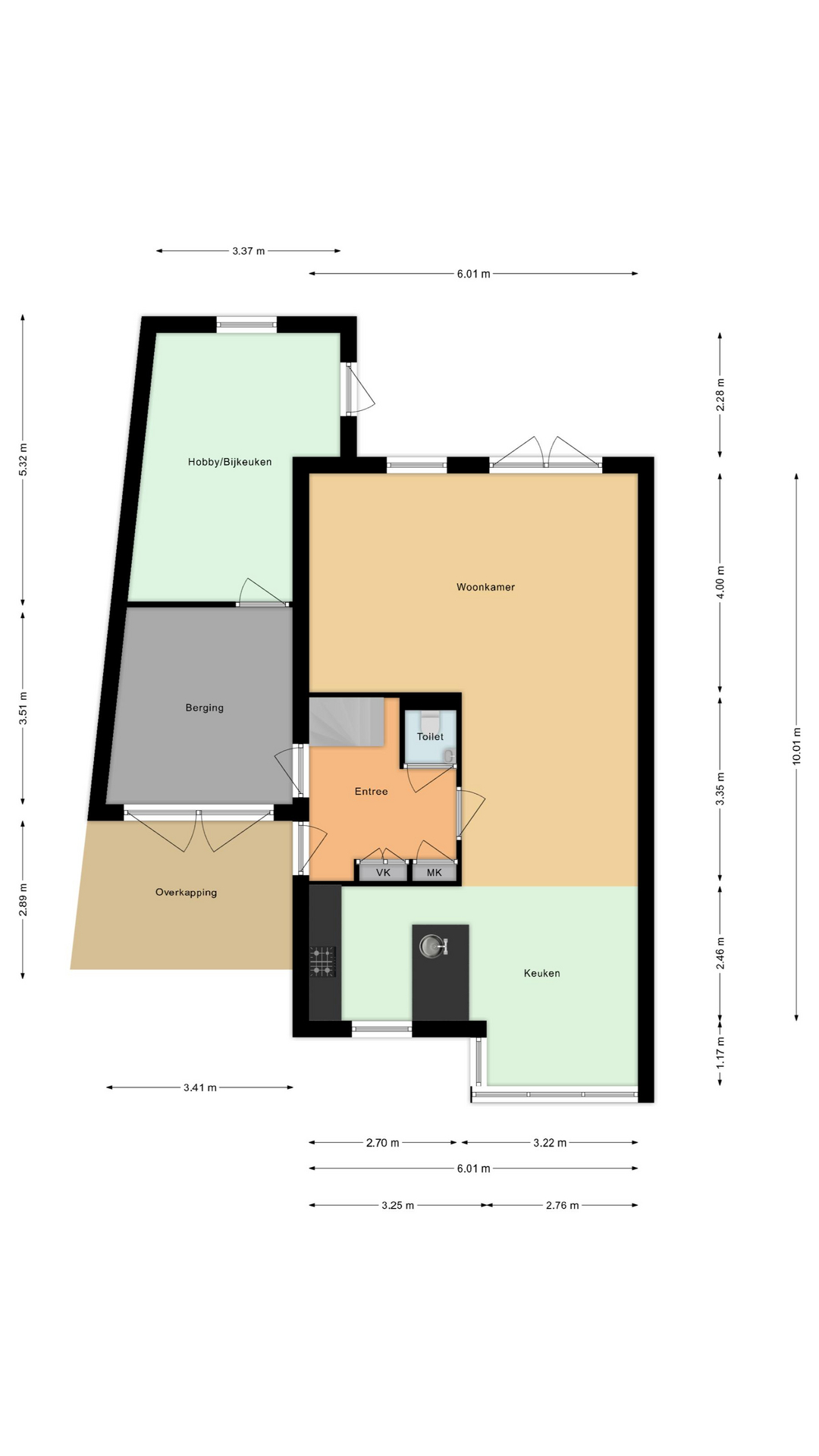 Entree met hal, toilet en trapopgang. De ruime woonkamer is voorzien van openslaande deuren naar de achtertuin en een sfeervolle gashaard. De open keuken staat in verbinding met de woonkamer. Vanuit de woning is er toegang tot de voormalige garage, die is ingericht als berging en hobbykamer.