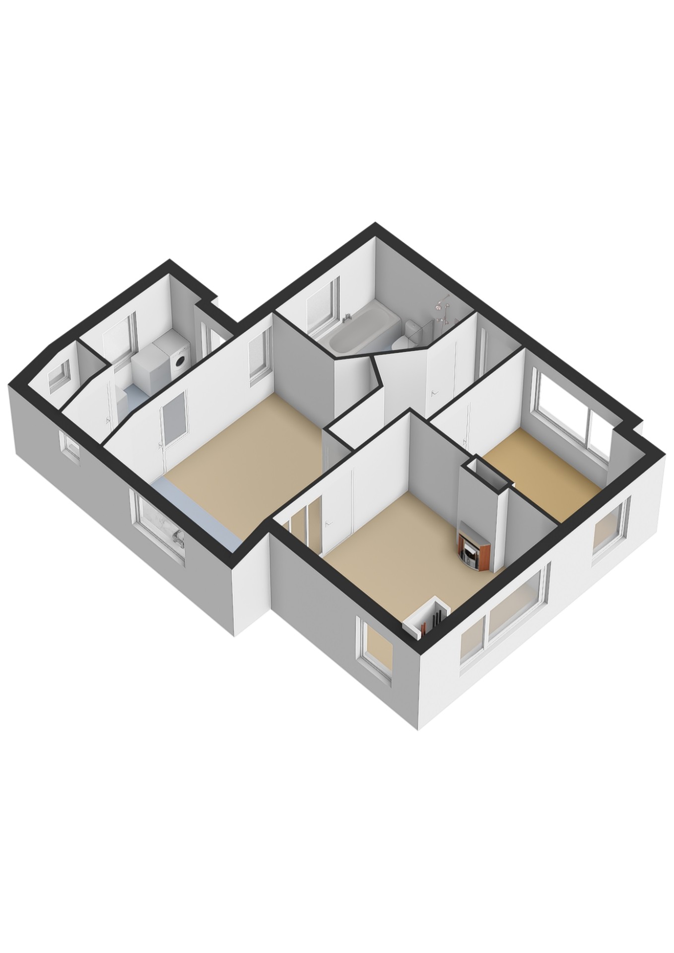 Begane grond: entree/ hal – slaapkamer – badkamer met ligbad, douchecabine, toilet en wastafelmeubel – CV-opstelling – trapopgang – dichte keuken – woonkamer met gaskachel met schouw – bijkeuken – toilet.