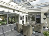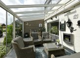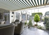 Deze overkapping is de perfecte plek om het hele jaar door van de tuin te genieten. Dankzij het elektrisch zonnescherm en de glazen deuren, die volledig open kunnen, zit je hier beschut in het voorjaar en najaar én heerlijk koel in de zomer.