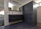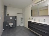 De badkamer, gerealiseerd in 2020, is royaal en luxe ingericht. Je vindt hier een grote inloopdouche met zitje, een dubbel wastafelmeubel, een handdoekradiator, een toilet, airco en vloerverwarming.
