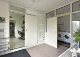 Via de keuken bereik je een tussenportaal met deuren naar de bijkeuken, garage en achtertuin. In de bijkeuken vind je de opstelling van de cv-ketel (Intergas, 2020), aansluitingen voor wasmachine en droger, een pantry en een uitstortgootsteen.