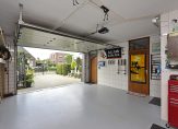 De ruime garage biedt plaats aan twee auto’s. Hier vind je ook een extra berging, een toegangsdeur naar de bijkeuken en een elektrische garagedeur naar buiten.