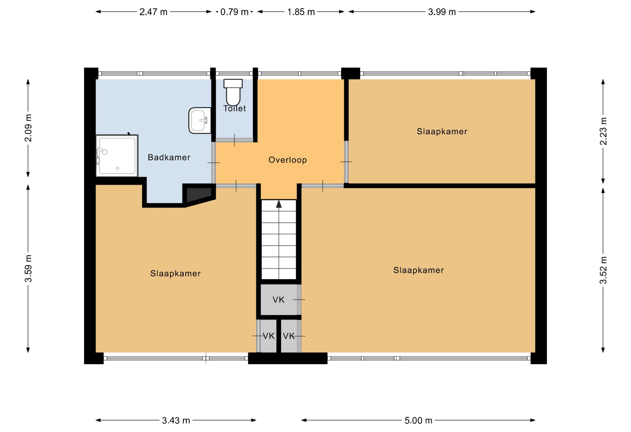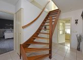Via een vaste trap kom je op de overloop van de eerste verdieping. Aan de rechterzijde vind je twee ruime slaapkamers, terwijl je aan de linkerzijde een derde slaapkamer, een badkamer en een separaat toilet aantreft.