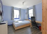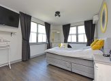 Aan de voorzijde bevindt zich een ruime slaapkamer met veel bergruimte onder de schuine kap en een airco.