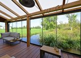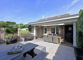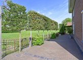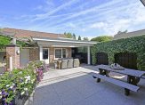 Aan de achterzijde ligt het onderheide terras met windschermen, de garage met bijgebouw en overkappingen aan de voor- en achterzijde.
