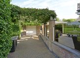 Aan de voorzijde is de tuin omheind met een hek. Je betreedt de tuin via de deur in het hek of het elektrische toegangshek. Rechts naast de woning bevindt zich de entree en links de onderheide oprit met perenbloesem- en sierappelbomen.