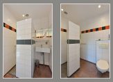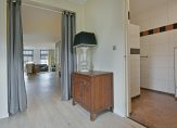 Via de entree betreed je de lichte tuinkamer, die tevens dient als praktische bijruimte met een kast voor de cv-installatie, een aparte wasruimte voor wasmachine en droger, en een garderobe. Vanuit hier heb je toegang tot de moderne badkamer, voorzien van een inloopdouche, wastafelmeubel en toilet.