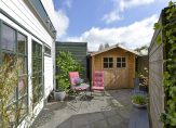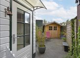Achter de woning ligt een onderhoudsvriendelijke, betegelde tuin. Hier vindt u ook de houten schuur, nieuw geplaatst in 2024, ideaal voor extra opslagruimte.