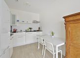De woonkamer is heerlijk licht dankzij de grote ramen. De halfopen keuken is praktisch opgesteld in een L-vorm en voorzien van een gaskookplaat, vaatwasser, magnetron en koel-/vriescombinatie. Via de woonkamer én de slaapkamer heb je toegang tot het zonnige terras met vrij uitzicht op het voormalige klooster en het IKC-schoolcomplex.