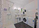 De badkamer beschikt over een wastafel, douche met thermostaatkraan en een aansluiting voor de wasmachine.