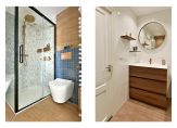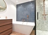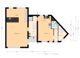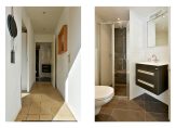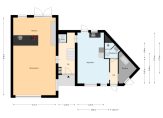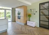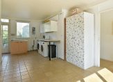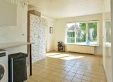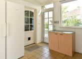 Aangrenzend ligt de zeer ruime bijkeuken. Deze is dankzij het formaat en de aanwezige badkamer op de begane grond eenvoudig te gebruiken als extra slaapkamer, kantoor, praktijkruimte of zelfs zelfstandige woonunit (eventueel na toestemming). Momenteel is de bijkeuken netjes afgewerkt met plavuizen vloer, keukenblok, aansluitingen voor wasmachine en droger, en ruimte voor een grote koel-/vriescombinatie. De moderne badkamer hier is voorzien van douchehoek met thermostaatkraan, wastafelmeubel en vrijhangend toilet.
