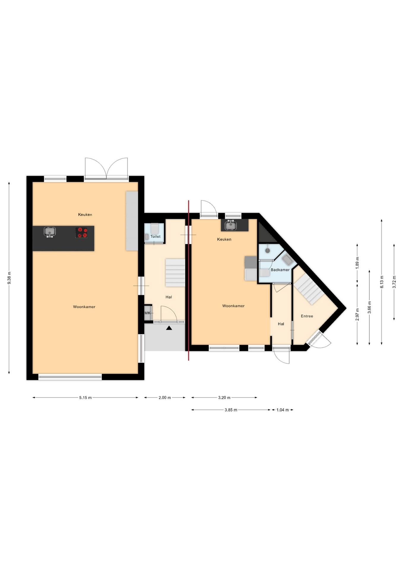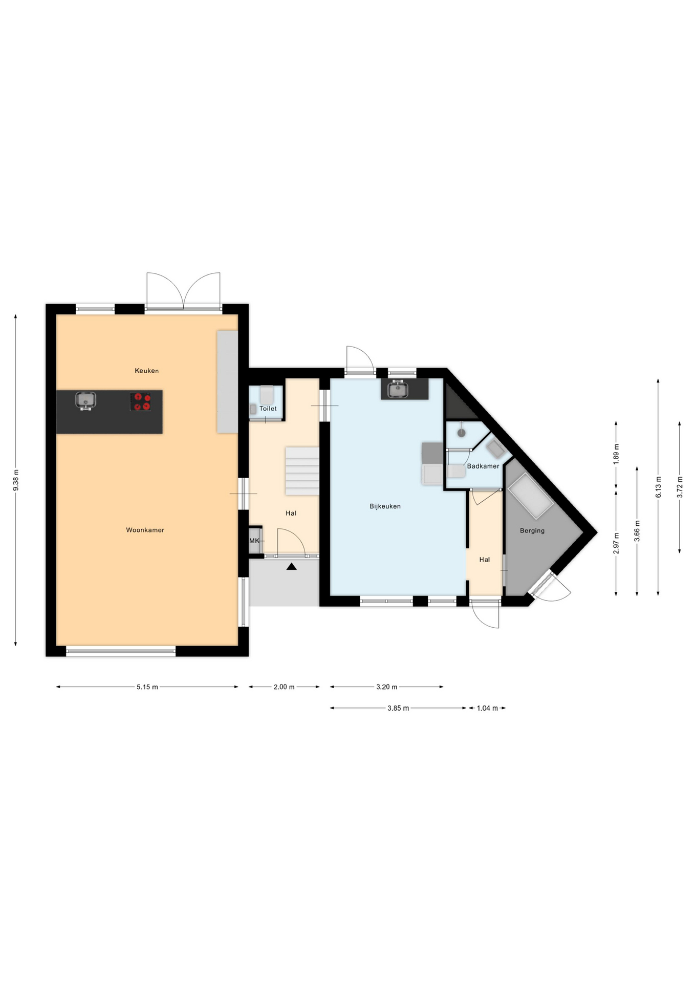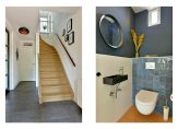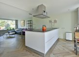 Overdekte entree met hal, trapopgang, meterkast en moderne toiletruimte. De woonkamer ligt aan de rustige straatzijde, is ruim opgezet en voorzien van een pvc-vloer met vloerverwarming. De moderne keuken (2018) is een echte blikvanger met kook-/spoeleiland, inductiekookplaat, afzuigkap, ruime spoelbak en veel opbergruimte. In de kastenwand vind je een oven, combi-oven en koelkast. Vanuit de keuken stap je zo de zonnige achtertuin in.