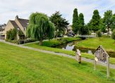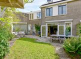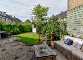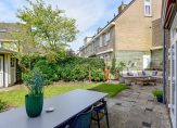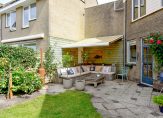 De achtertuin op het westen is sfeervol aangelegd met gazon, sierbestrating en borders. De beschutte zithoek bij de bijkeuken nodigt uit om al vroeg in het seizoen buiten te zitten. Achterin staat een tuinhuis, er is een achterom en er is parkeergelegenheid op eigen terrein voor meerdere auto’s.