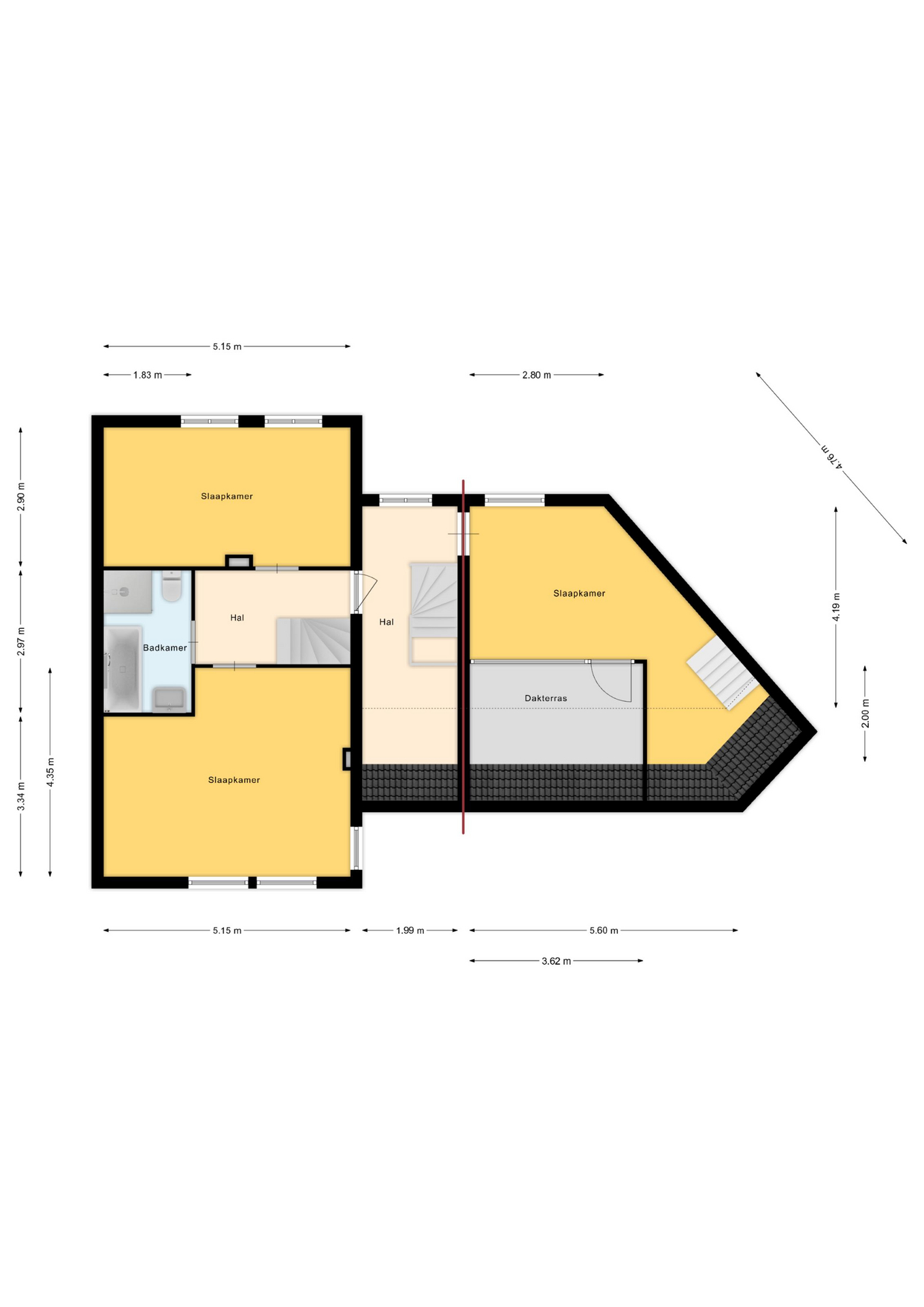 Ruime overloop met raam en toegang tot drie grote slaapkamers en een tweede badkamer. Aan de voorzijde zijn twee kamers samengevoegd tot één royale slaapkamer. De derde slaapkamer heeft toegang tot het dakterras en biedt ook de optie voor een trap naar beneden. De badkamer is stijlvol afgewerkt en volledig vernieuwd in het najaar van 2022 en voorzien van douchecabine, ruim ligbad, wastafelmeubel, vrijhangend toilet en designradiator.