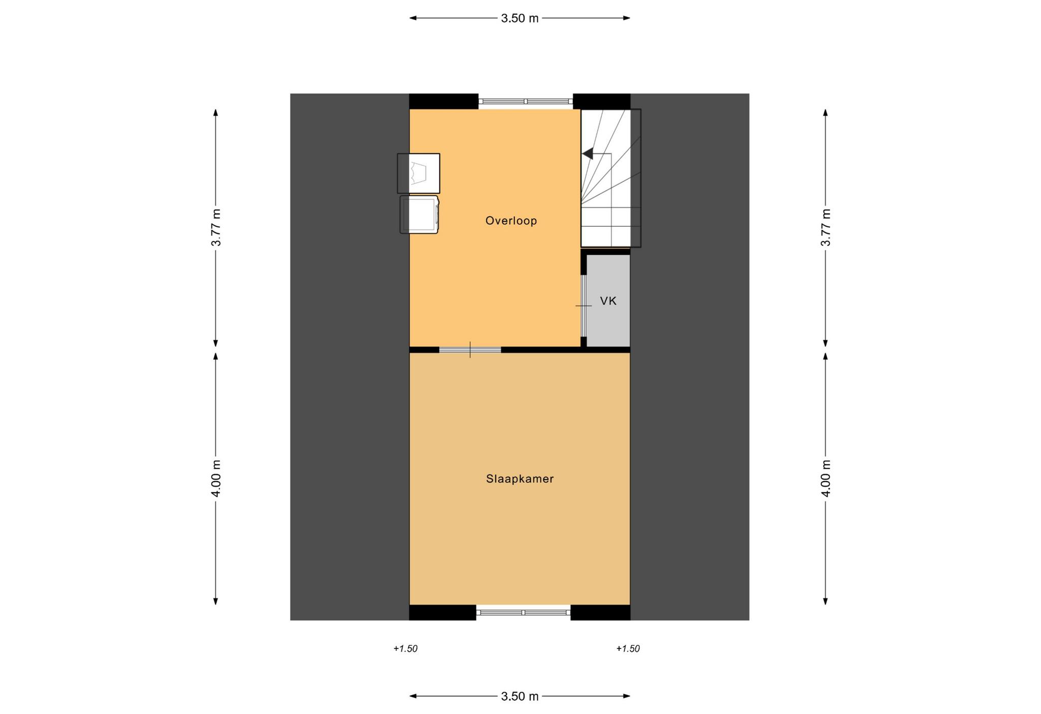 Ook de tweede verdieping bereik je via een vaste trap. Hier vind je de overloop met aansluitingen voor wasapparatuur, bergruimte achter de knieschotten, een vaste kast én een vijfde royale slaapkamer.