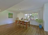 De woonkamer is Z-vormig en heerlijk ruim. Aan de achterzijde bevindt zich de eethoek, een verdiepte kelderkast en de open keuken.