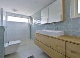 De moderne badkamer (geplaatst in 2019) is ruim opgezet met een royale inloopdouche, een stijlvol wastafelmeubel, hangend toilet en handdoekradiator.