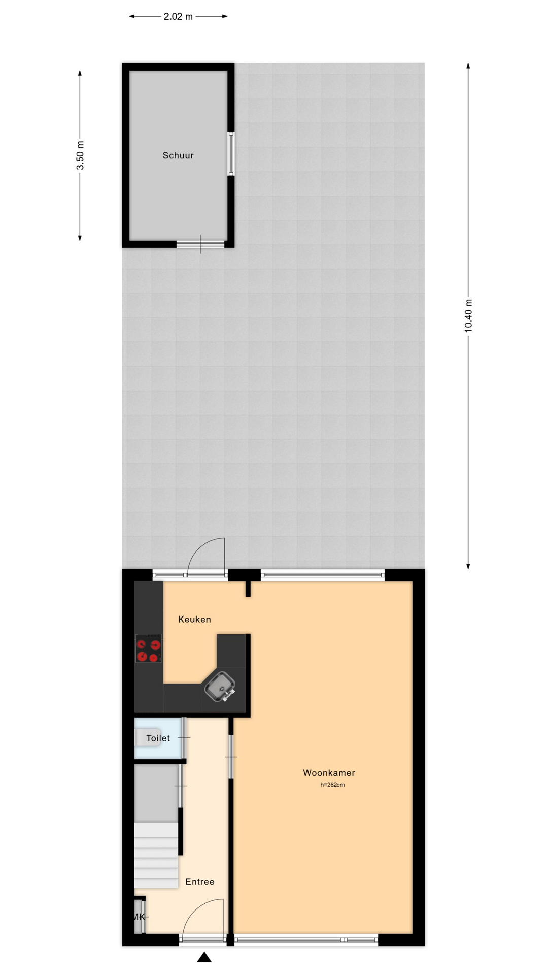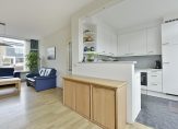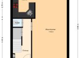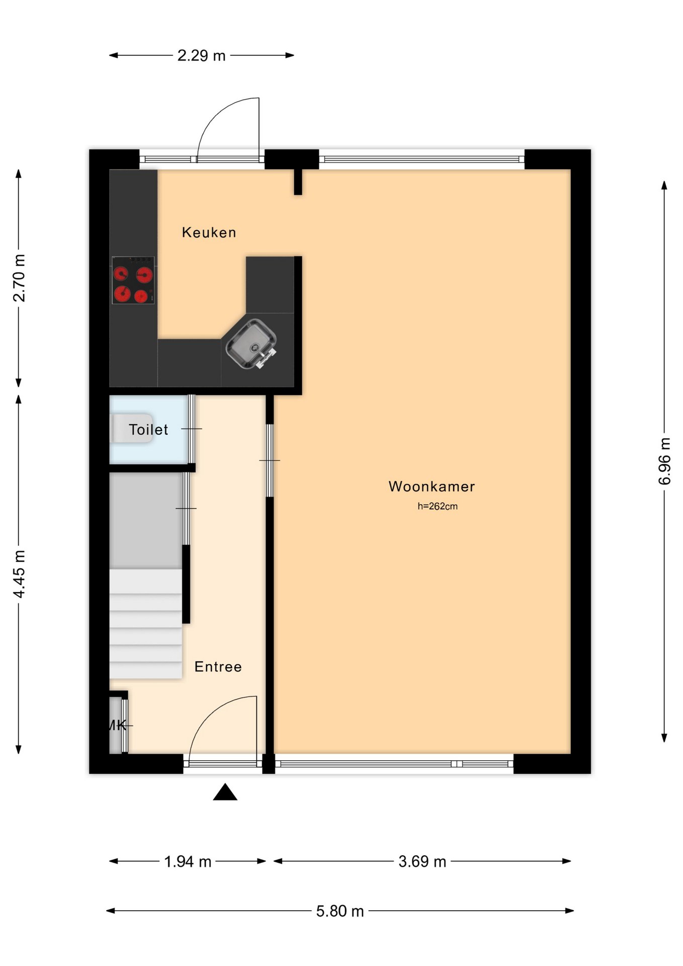 Voorentree van de woning, hal met meterkast (met 3 fase), trap naar eerste verdieping en een trapkast onder de trap en aansluitend het toilet. Vanuit de hal is ook de lichte woonkamer te bereiken. Door grote raampartijen aan de voor- en achterzijde is er veel natuurlijke lichtinval. De open keuken is gelegen aan de achterzijde in een hoekopstelling voorzien van vaatwasser, inductiekookplaat, afzuigkap, combi-oven en een koel- vriescombinatie. Vanuit de keuken is er een deur naar de achtertuin.