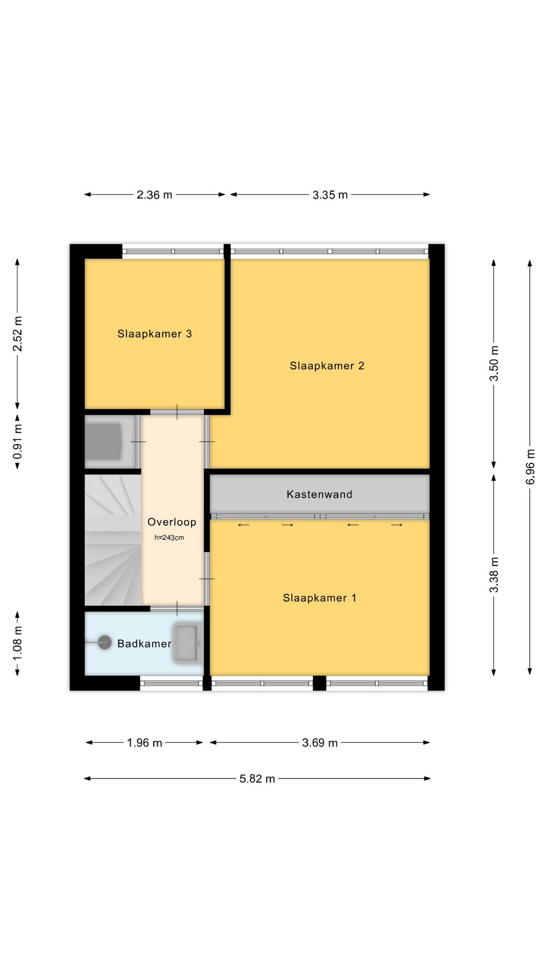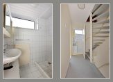 Via een vaste trap is de overloop van de eerste verdieping te bereiken. We vinden hier een vaste kast (met aansluiting voor de wasmachine), slaapkamer aan de voorzijde met vaste kastenwand en twee slaapkamers aan de achterzijde. Aan de voorzijde is de badkamer voorzien van douche en wastafelmeubel.
