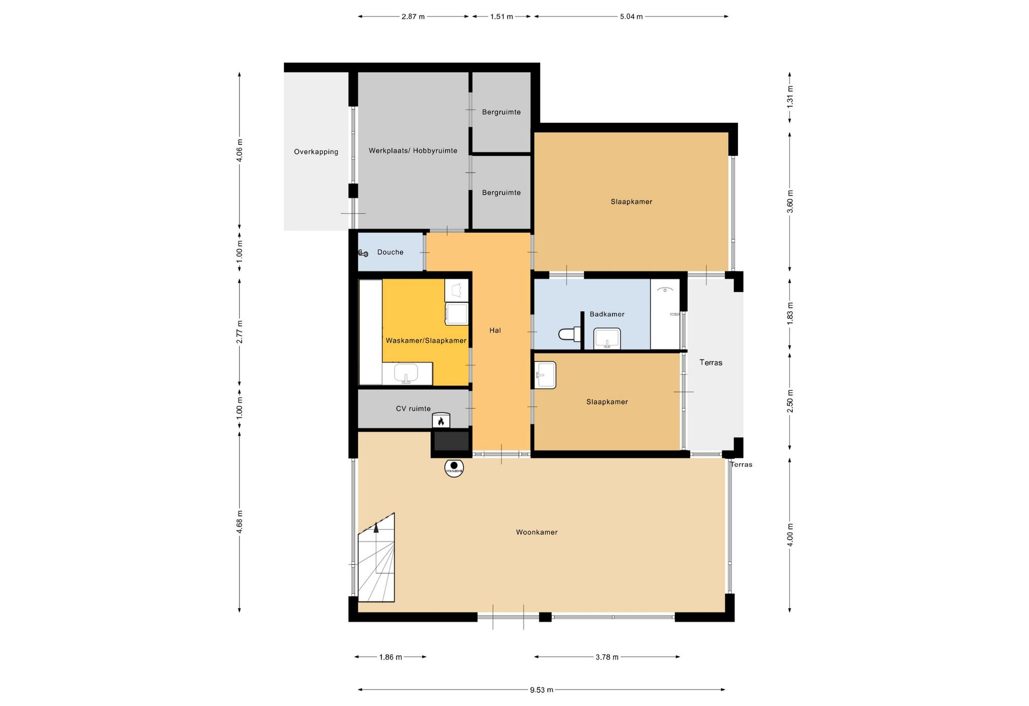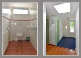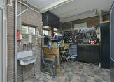 Daarnaast is er nog een aparte doucheruimte en een grote werkkamer – nu in gebruik als werkplaats – aan de voorzijde met veel opbergruimte in vaste kasten en toegangsdeur naar de tuin.