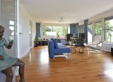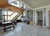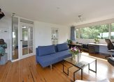 Via de vaste trap in de woonkamer bereik je de begane grond, die op tuinniveau ligt. Hier vind je een tweede, ruime woonkamer met een sfeervolle houtkachel en prachtig vrij uitzicht over de fraai aangelegde tuin.