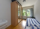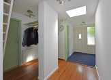 Dankzij de zijramen en twee Velux dakramen is er volop natuurlijk licht. De kamer beschikt over een eigen wastafel. De aangrenzende berging biedt veel handige extra opbergruimte.