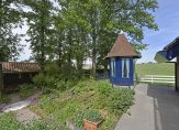 Tot slot: het sfeervolle ‘theehuisje’ met puntdak en gordijntjes — een idyllisch plekje met een prachtig uitzicht op de tuin. De lammetjes van de buren komen af en toe nieuwsgierig even kijken bij het hek.