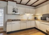 In de halfopen keuken staat een lichte hoekopstelling met een dubbele spoelbak, een ingebouwde gaskookplaat en een koelkast. Overige apparatuur kan los worden geplaatst, of kies je toch voor een volledig nieuwe keuken met inbouwapparatuur? Achter de deur met glas in loodraam is de verwarmde bijkeuken met de aansluitingen voor de wasmachine, droger en vaatwasser. De inpandig te bereiken garage, met een grote sectionaalpoort, heeft een oppervlakte van circa 29 m2.