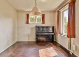 De woon-/eetkamer van bijna 7.50 meter breed is een lichte leefruimte, met ramen aan drie zijden en een deur naar de zijtuin. Drie ramen zijn uitgevoerd met glas in lood en naast de buitendeur zie je de compacte schouw met open haard.