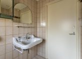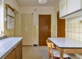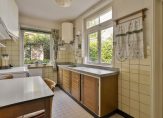 Vanuit de hal en woonkamer is de dichte keuken te bereiken. De originele wand- en vloertegels zijn behouden en het keukenblok met granito blad is jarenlang naar tevredenheid gebruikt. In de hoek van de keuken is een handige en ruime berging/voorraadkast.