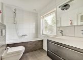 De overloop geeft u toegang tot 3 slaapkamers en een badkamer. De moderne badkamer met een ligbad met douchescherm, dubbele wastafel met meubel en een toilet.