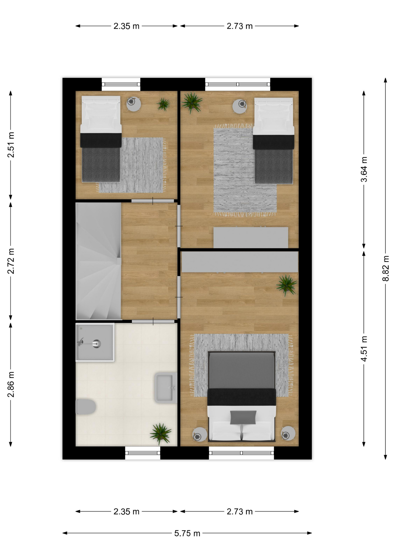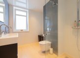 Overloop, drie slaapkamers van ca. 12, 10 en 6 m² en een moderne badkamer met inloopdouche, dubbele wastafel met meubel en tweede toilet.