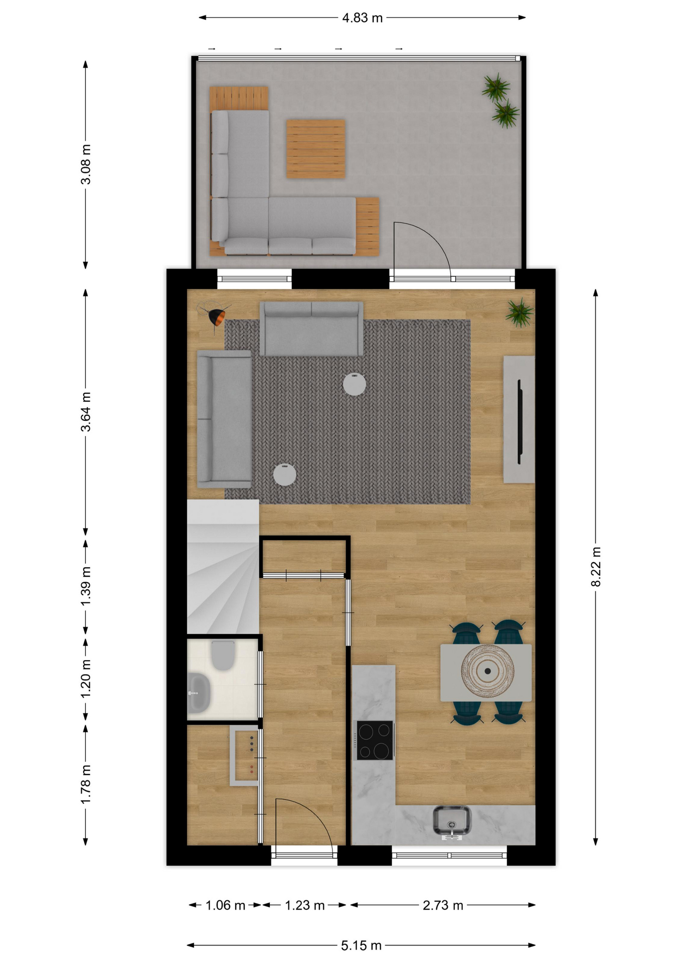 Entree/hal met toilet, meterkast, technische ruimte, lichte woonkamer met deur naar de tuinkamer van ca. 15 m² en een straatgerichte keuken met luxe inbouwapparatuur (inductiekookplaat, combi-oven, vaatwasser, koel- en vrieskast). De woonkamer en keuken zijn samen ca. 31 m² groot.