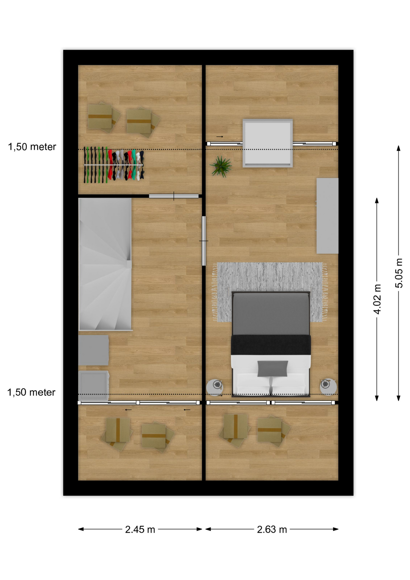 Via een vaste trap bereikbare slaapkamer van ca. 13 m² met op de overloop de witgoedaansluitingen en bergruimte achter de knieschotten.